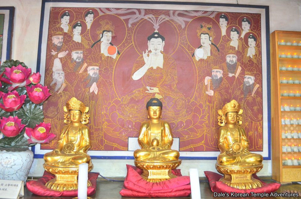 Stepping inside the Daegwangmyeong-jeon Hall, and resting on the main altar, are a set of seven statues (three larger statues joined by four smaller statues). Sitting in the centre of the three larger statues is an image of Amita-bul (The Buddha of the Western Paradise). This image is joined on either side by Gwanseeum-bosal (The Bodhisattva of Compassion) and Daesaeji-bosal (The Bodhisattva of Wisdom and Power for Amita-bul). To the far left of the smaller sized statues rests Seokgamoni-bul (The Historical Buddha), joined by Birojana-bul (The Buddha of Cosmic Energy), Amita-bul, and an all-white image of Gwanseeum-bosal to the far right. On the left wall is a memorial for the dead with an image of Jijang-bosal (The Bodhisattva of the Afterlife) in the centre of the shrine. And to the right hangs an older-looking Shinjung Taenghwa (Guardian Mural).