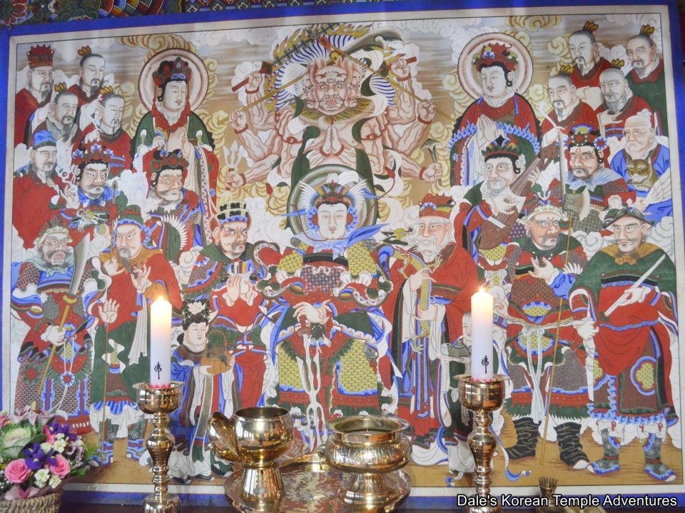 Past the pagoda and the book-ending dorms, you’ll find the temple’s main hall. Out in front of the Daeung-jeon Hall are a line of palm trees. Adorning the exterior walls of the main hall are a masterful collection of Shimu-do (Ox-Herding Murals). Stepping inside the Daeung-jeon Hall, you’ll find a triad of statues on the main altar. Sitting in the centre of this triad is the image of Seokgamoni-bul (The Historical Buddha), who is joined on either side by Munsu-bosal and Bohyeon-bosal. The red painting to the right of the main altar is dedicated to Jijang-bosal (The Bodhisattva of the Afterlife), while the red painting to the left is dedicated to Chilseong (The Seven Stars). The other mural taking up residence inside the Daeung-jeon Hall is a modern Shinjung Taenghwa (Guardian Mural). The ceiling inside the main hall, especially over the main altar, is adorned with a beautiful collection of various Buddhist-related murals.