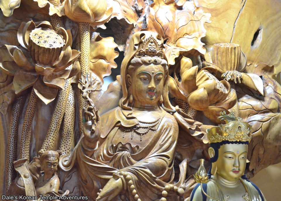 To the rear of the temple grounds, and situated in the upper courtyard, are a pair of shrine halls. The first, which has a beautiful view out towards the neighbouring East Sea, is the Gwaneum-jeon Hall. Fronted by a slim five-story pagoda is the newly built shrine hall, which houses two different incarnations of the Bodhisattva of Compassion, Gwanseeum-bosal. The first is a diminutive golden statue of Gwanseeum-bosal, while the other is an elaborate wooden carving dedicated to the Bodhisattva of Compassion.