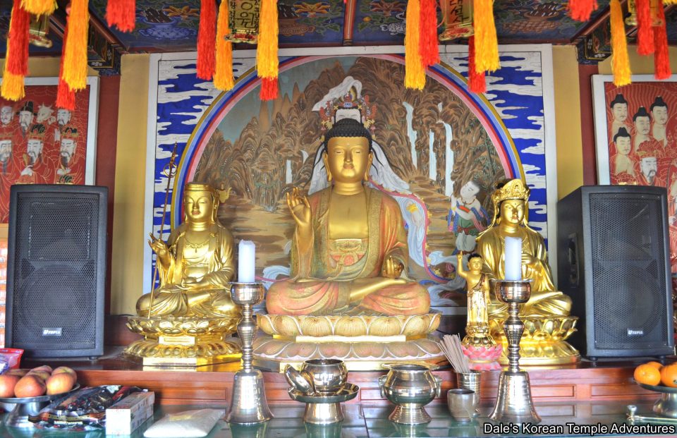 The other shrine hall that visitors can explore at Suamsa Temple is the Samseong-gak Hall, which is slightly elevated and to the right of the Geukrak-jeon Hall. This shaman shrine hall is made of brick. When you first step inside this shrine hall, you’ll instantly notice that the main altar is slightly different than other temples. Instead of housing the more traditional images of Chilseong (who is usually centrally located), and joined by images of Sanshin (The Mountain Spirit) and Dokseong (The Lonely Saint) on either side, Suamsa Temple’s Samseong-gak Hall has a little different configuration. At Suamsa Temple, a painting of Dokseong is hung in the centre, while to the right hangs an image of Sanshin and to the left a painting of Yongwang (The Dragon King).